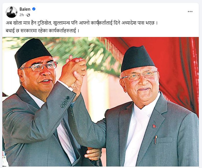 ‘अब खोला मात्र हैन टुडिखेल, खुल्लामञ्च पनि आफ्नो कार्यकर्तालाई दिने अध्यादेश पास भएछ’ फेसबुकमा उनले भनेका छन्, ‘बधाई छ सरकारमा रहेका कार्यकर्ताहरुलाई ।’