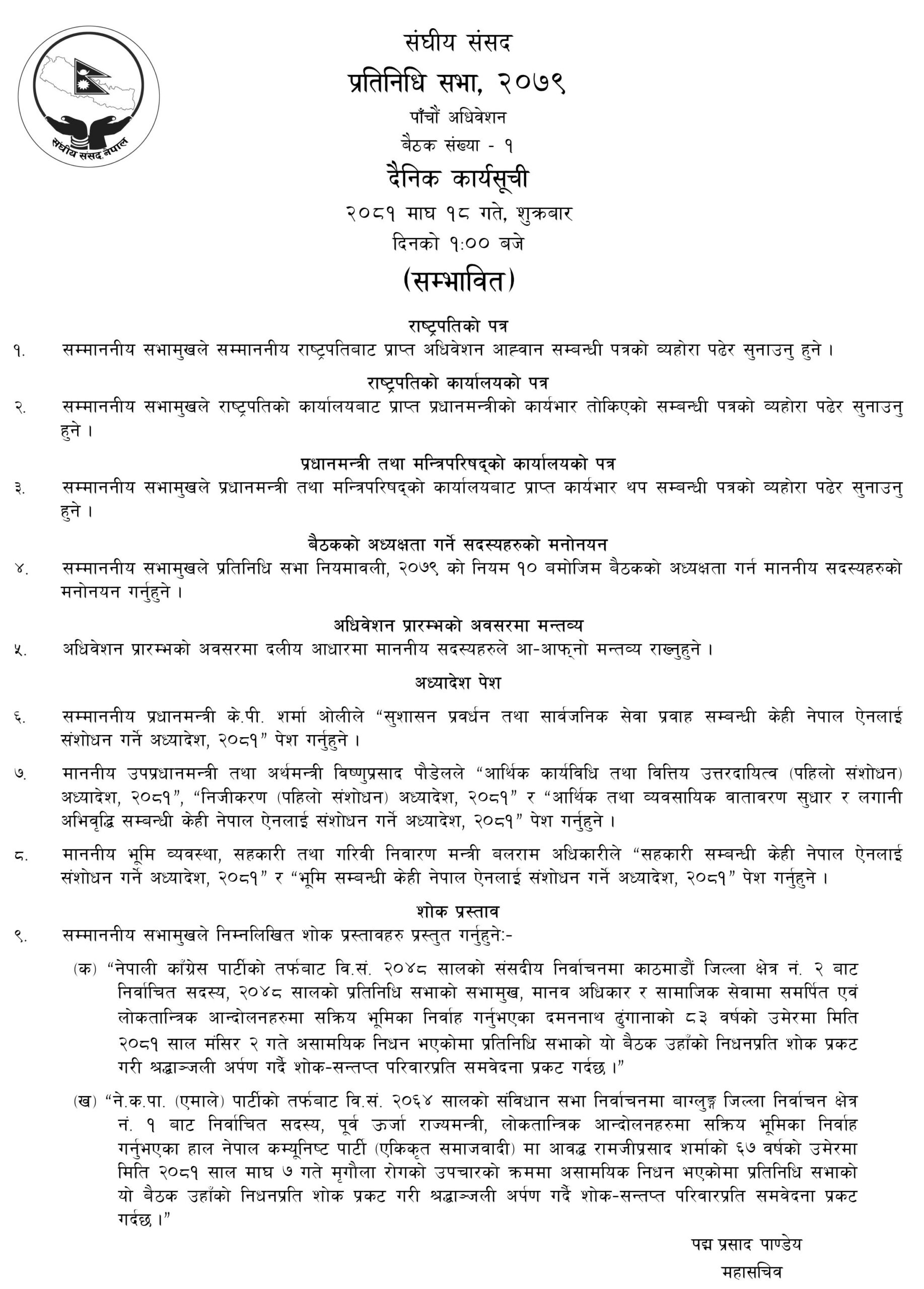 पूर्वसभामुख दमन्नाथ ढुंगाना र पूर्व ऊर्जा राज्यमन्त्री रामजीप्रसद शर्माको निधनप्रति शोक प्रस्ताव गरिने कार्यसूची रहेको छ ।
