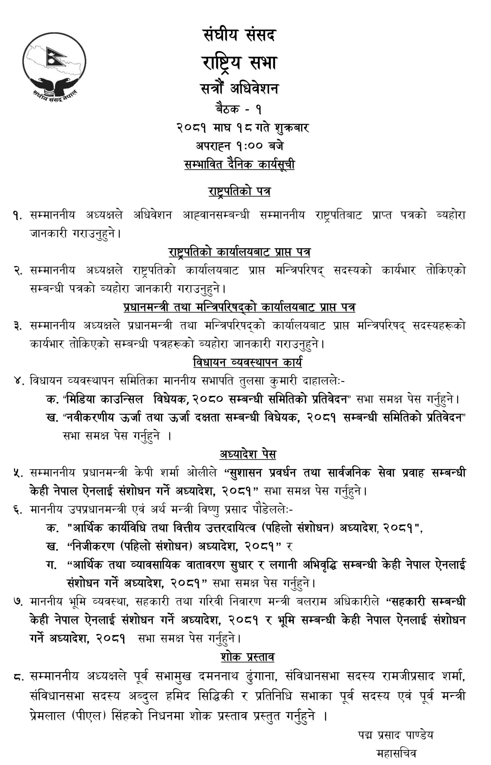 त्यस्तै राष्ट्रियसभामा भने पूर्वसभामुख ढुंगानाप्रतिको शोक प्रस्ताव मात्र कार्यसूचीमा रहेको छ ।