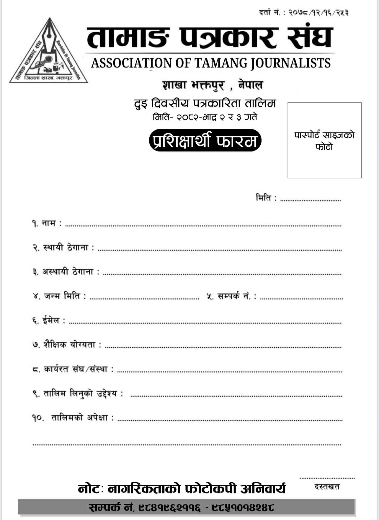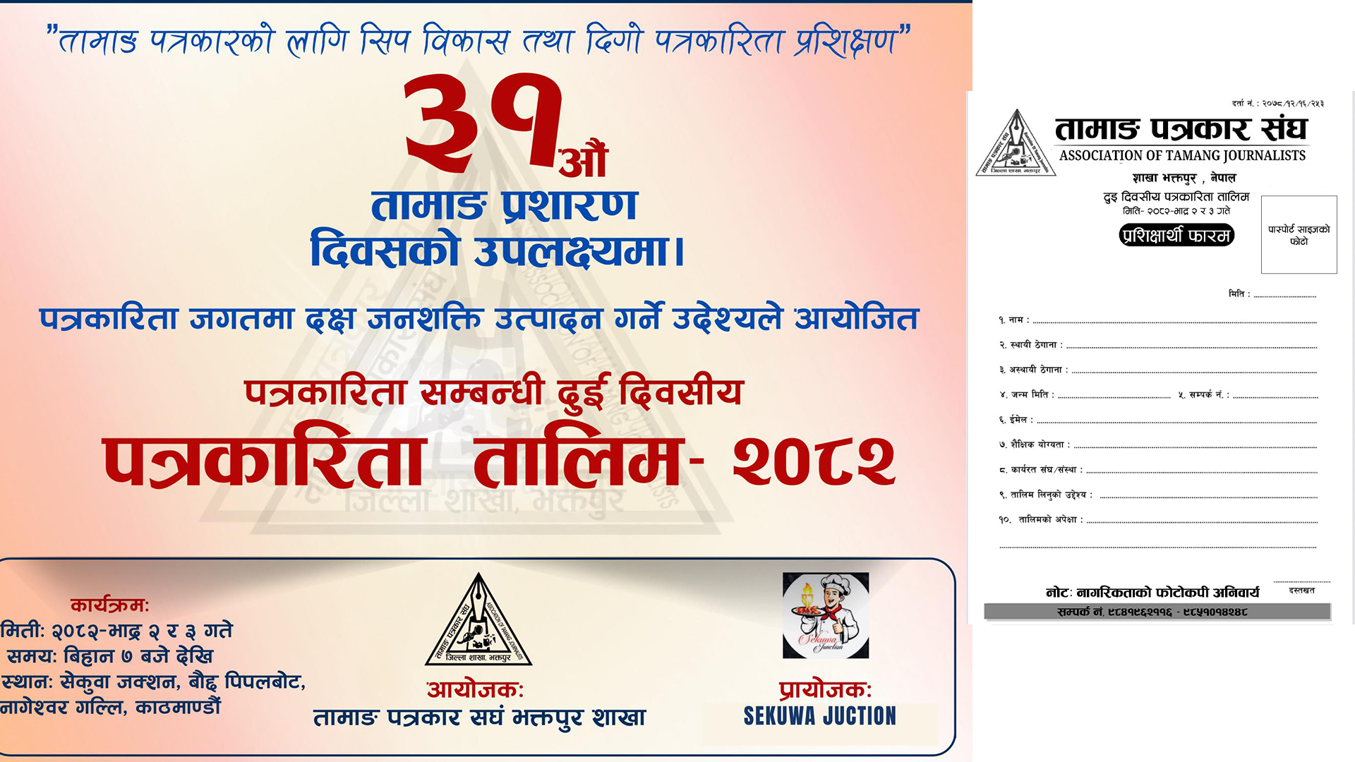 भक्तपुर – ३१ औं तामाङ प्रशारण दिवसको अवसरमा तामाङ पत्रकार संघ भक्तपुर जिल्ला शाखाले दुई दिने निशुल्क पत्रकारिता प्रशिक्षणको आयोजना गर्ने भएको छ। आगामी भाद्र २ र ३ गते बिहान ७ बजेबाट सुरु हुने उक्त कार्यक्रम काठमाडौंको बौद्ध पिपलबोट, नागेश्वर गल्लि स्थित सेकुवा जक्सनमा सम्पन्न हुनेछ।