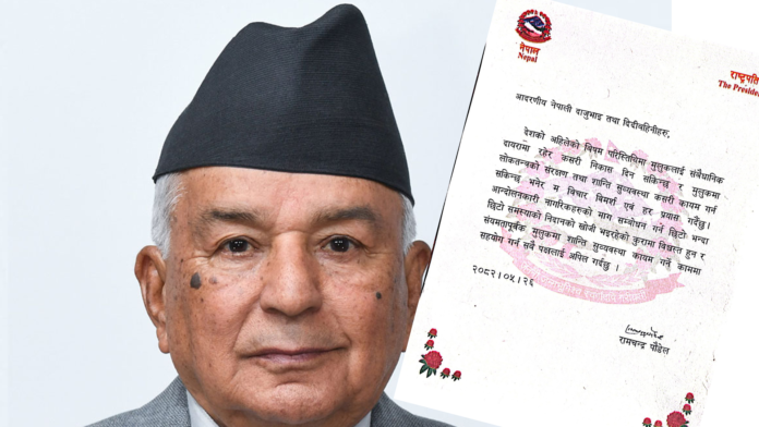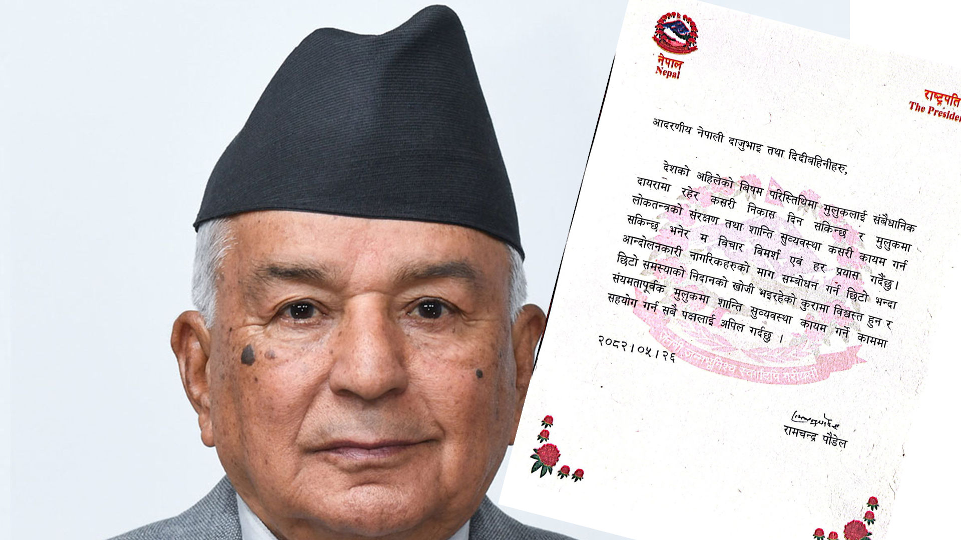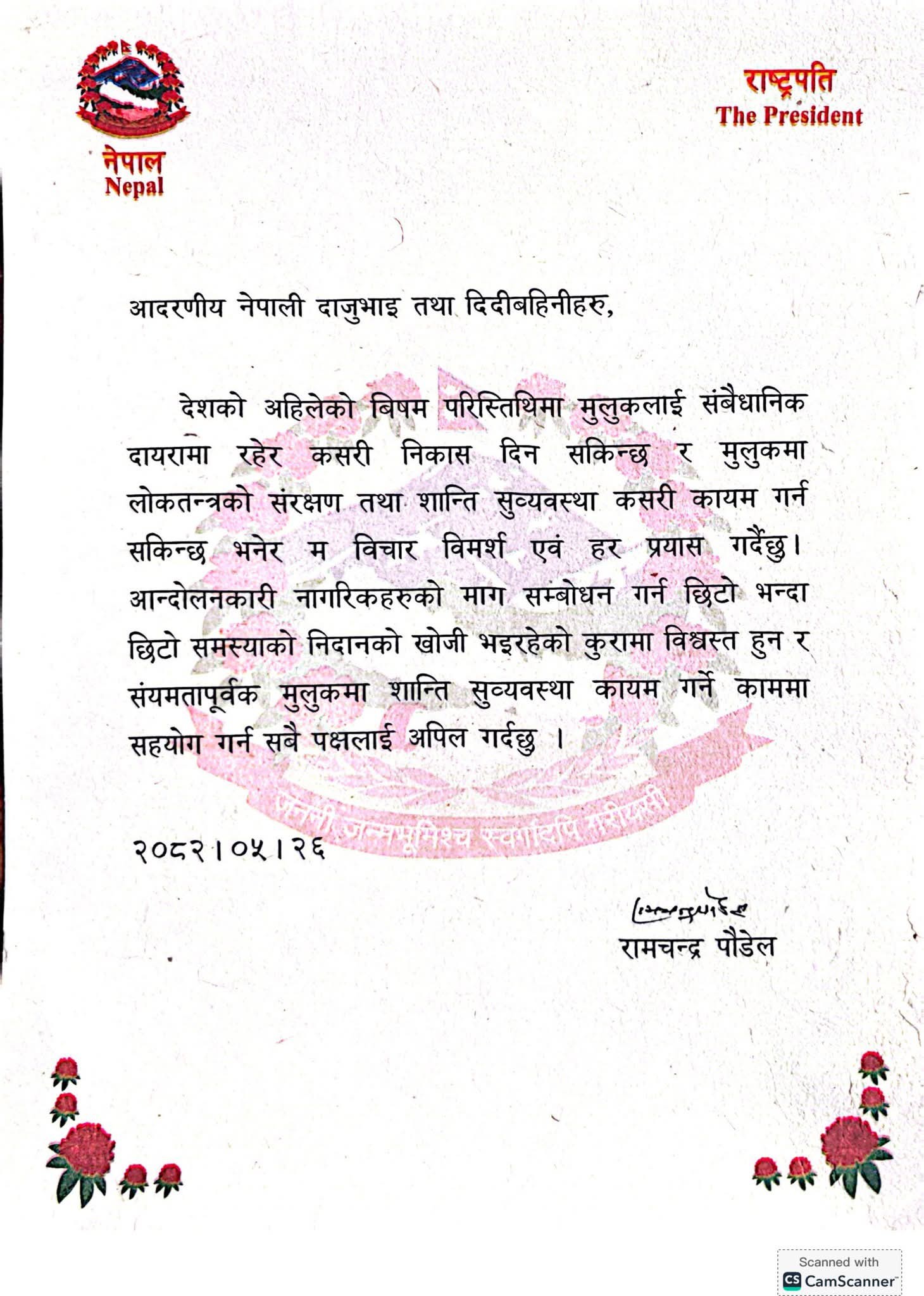आज (बिहीबार) जारी गरेको विशेष अपिलमा राष्ट्रपति पौडेलले हालको परिस्थितिप्रति गम्भीर चासो व्यक्त गर्दै आन्दोलनको समाधान संवाद र सहमतिको बाटोबाट खोज्न सकिने उल्लेख गरेका छन्। उनले भने, “हामी सबै मिलेर संविधानलाई आधार मानेर अघि बढेमा लोकतन्त्रको संरक्षण, सुशासनको प्रत्याभूति र जनताले खोजेको शान्ति सुव्यवस्था सम्भव छ।”