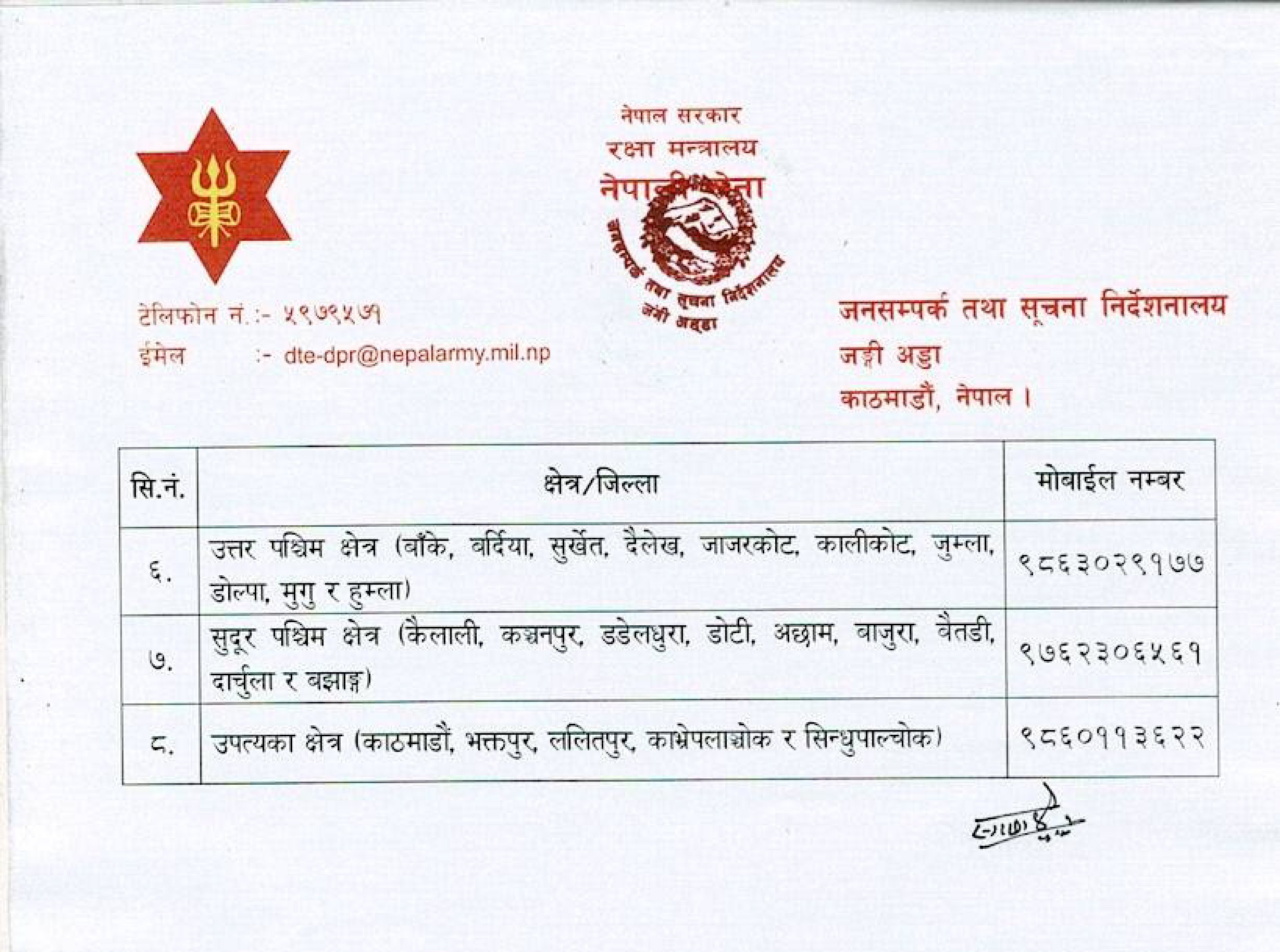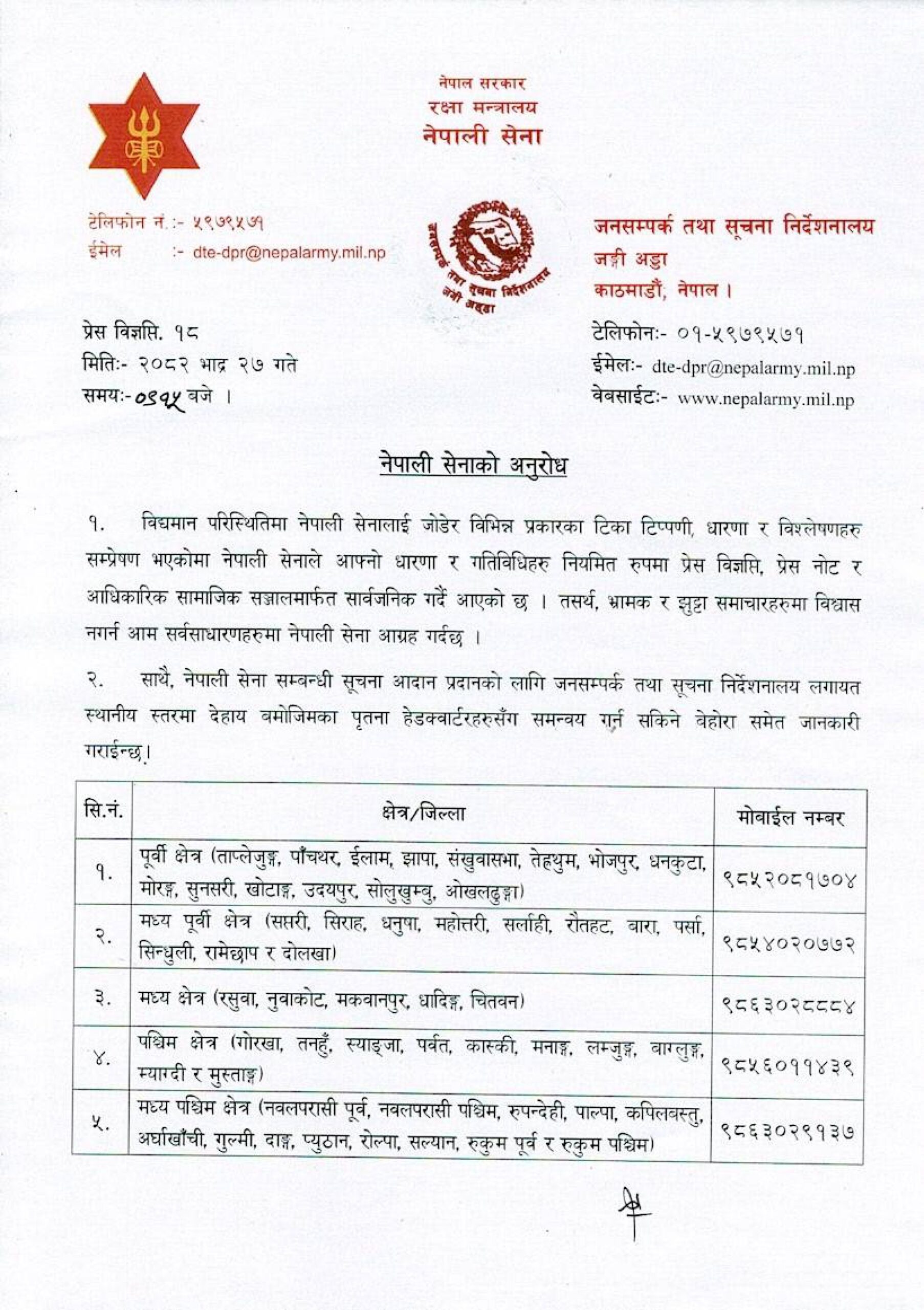 साथै, आवश्यक परे जनसम्पर्क निर्देशनालय वा स्थानीय पृतना हेडक्वार्टरसँग समन्वय गर्न सकिने जानकारी दिएको छ।
