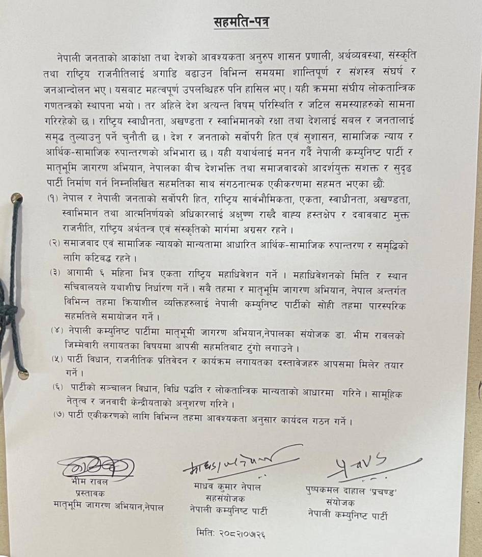 भीम रावलको ‘मातृभूमि जागरण अभियान’ नेकपामा समाहित, सात बुँदे सहमति सार्वजनिक