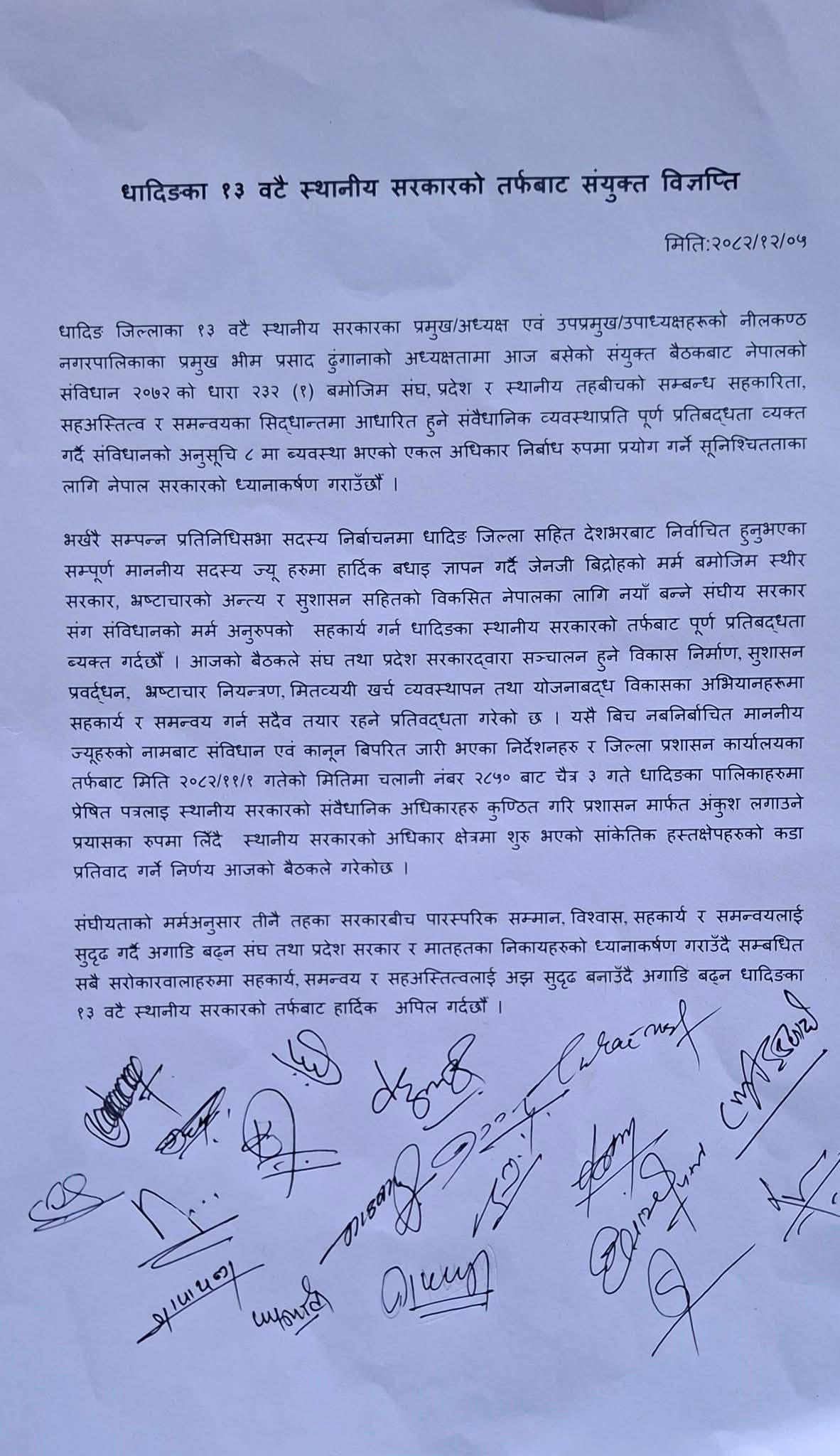 विज्ञप्तिमा नेपालको संविधान २०७२ ले प्रत्याभूत गरेको स्थानीय तहको अधिकार कार्यान्वयनमा अवरोध देखिएको उल्लेख गर्दै तीन तहका सरकारबीच समन्वय, सहकार्य र सहअस्तित्व कायम गर्नुपर्नेमा जोड दिइएको छ।