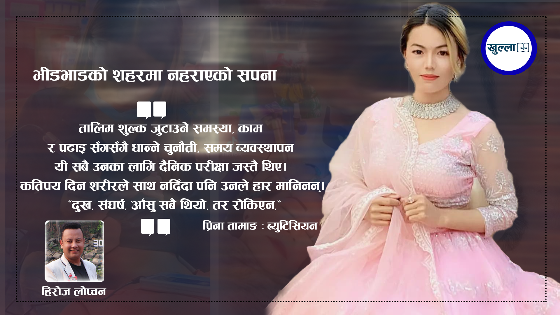 काठमाडौंमा जहाँ धेरै सपना हराउँछन्, त्यहीँ केही सपना संघर्षकै कारण अझ बलिया बन्छन्। राजधानीको भीडभाडभित्र हजारौं कथा हराइरहेका हुन्छन्। केही कथा भने संघर्षकै कारण अलग चिनिन्छन्। प्रिना तामाङको जीवनयात्रा त्यस्तै एउटा कथा हो । जहाँ अभावसँगको लडाइँ, सीपको निर्माण र सपनाको निरन्तर खोज, सुरुवात सानो हुन सक्छ, तर अठोट ठूलो थिए।
