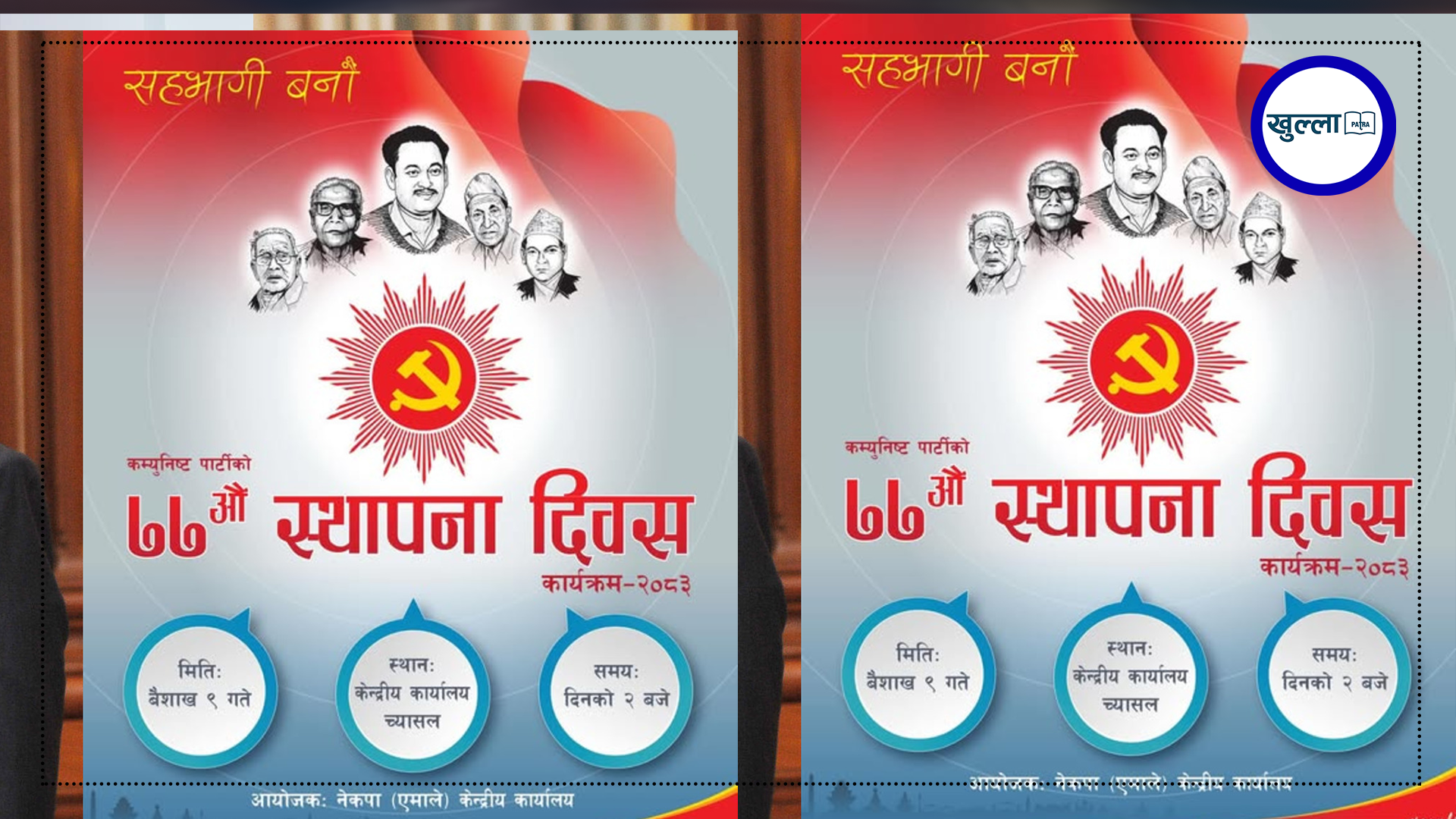 पोस्टरमा भने नेकपाका संस्थापकहरू पुष्पलाल श्रेष्ठ, नरबहादुर कर्माचार्य, निरञ्जन गोविन्द वैद्य, नारायणविलास जोशीमोतीदेवी श्रेष्ठ का श्यामश्वेत तस्बिर राखिएका छन्।