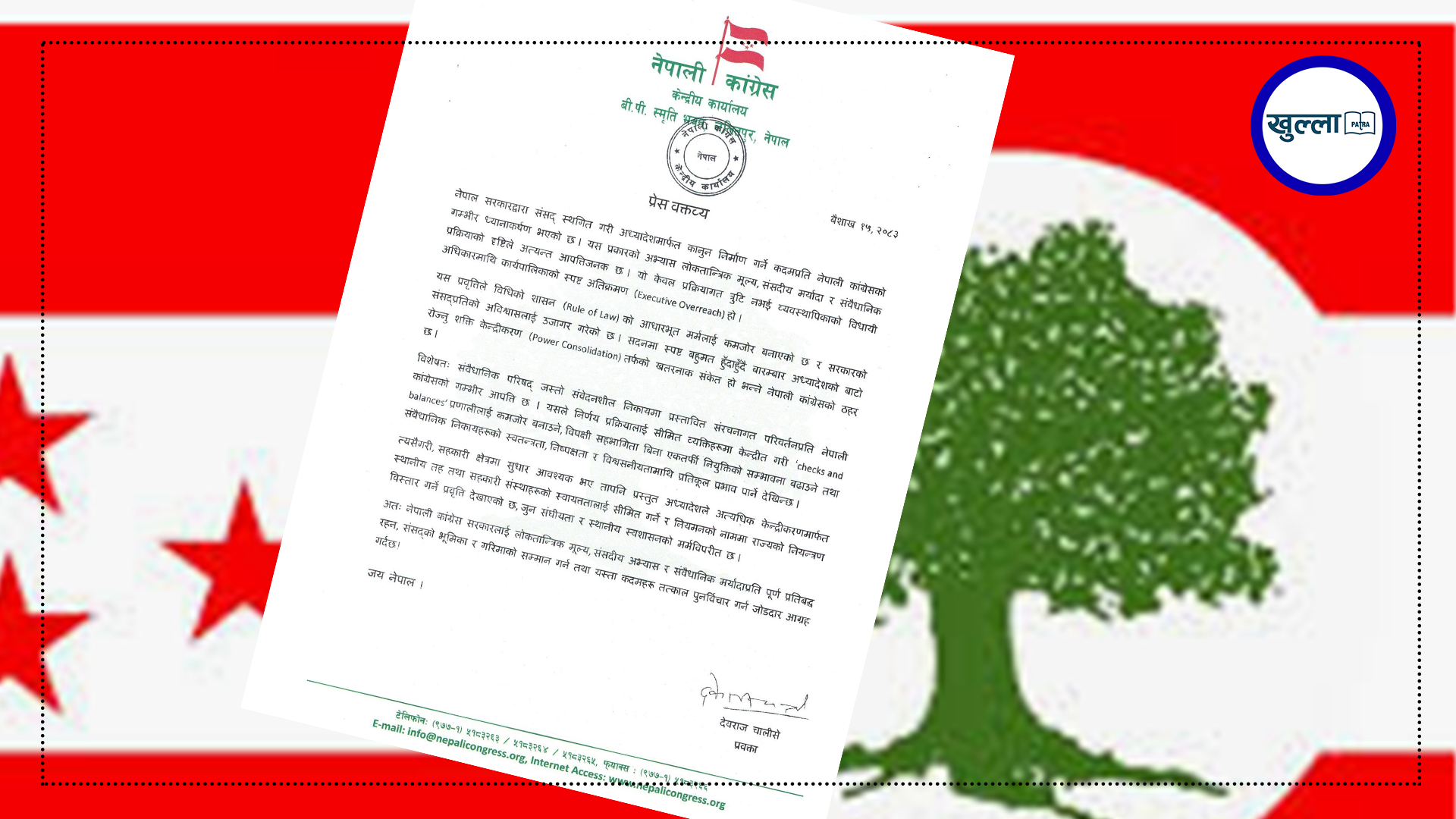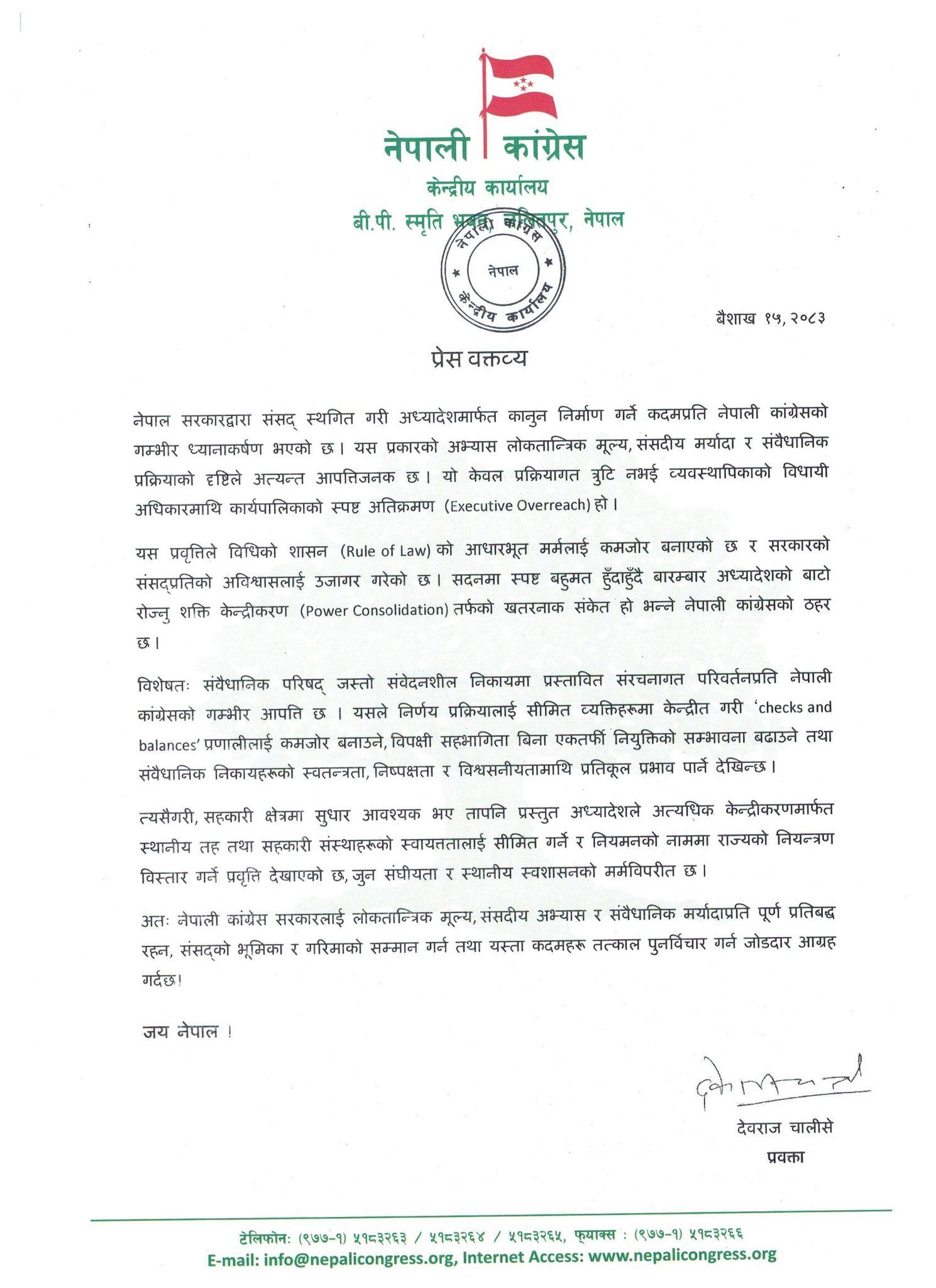 ‘नेपाल सरकारद्वारा संसद् स्थगित गरी अध्यादेशमार्फत कानुन निर्माण गर्ने कदमप्रति नेपाली कांग्रेसको गम्भीर ध्यानाकर्षण भएको छ,’ विज्ञप्तिमा भनिएको छ, ‘यस प्रकारको अभ्यास लोकतान्त्रिक मूल्य, संसदीय मर्यादा र संवैधानिक प्रक्रियाको दृष्टिले अत्यन्त आपत्तिजनक छ।’
